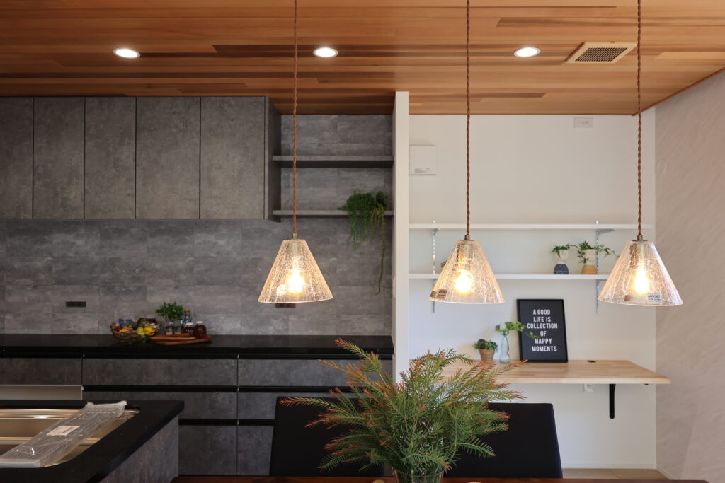 勾配天井がゆるやかに広がるLDKは、時間とともに表情を変える上質な空間。ナチュラルな木目がやわらかな陰影をつくり、リビングで過ごすひとときに深い安らぎを与えてくれます。キッチンからは家全体の気配が感じられ、作業をしながらも家族の存在が心地よく寄り添うような距離感に。ダイニングの上には柔らかな灯りが落ち、食事の時間を穏やかに包み込みます。