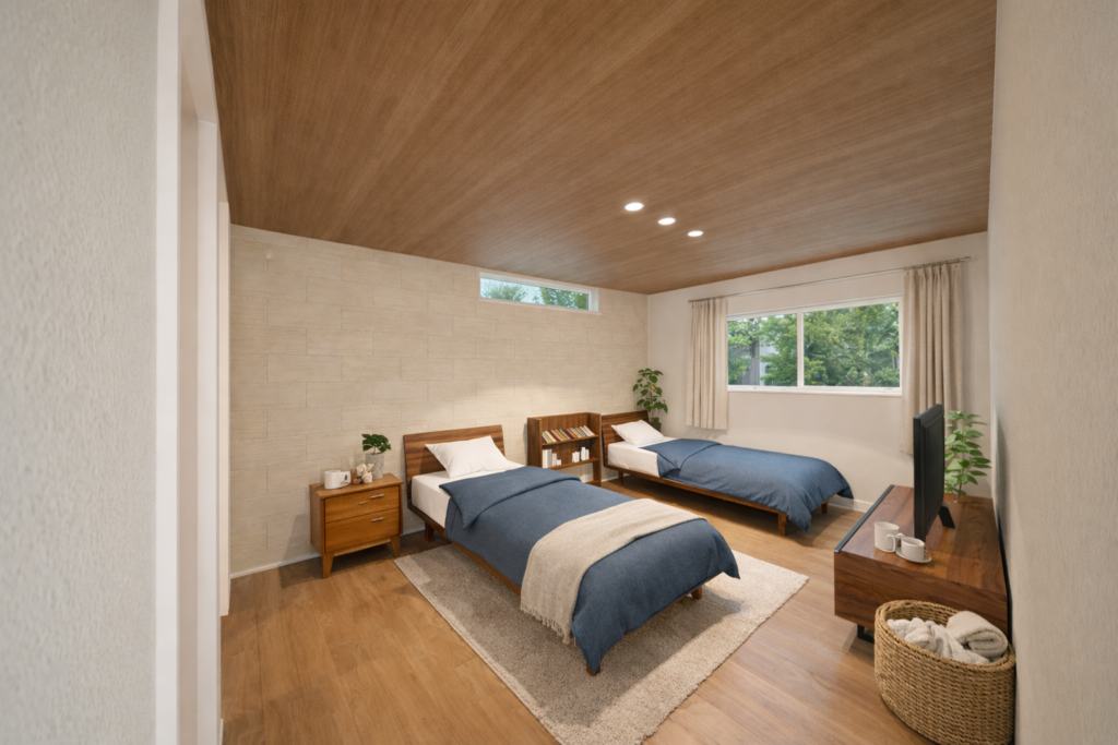 エアコンの風が直接当たらないため空気は静かで、くつろぎの時間や就寝時も快適さが続きます。家族の健康を考えた安心できる室内環境を、日常の中で自然に感じられる住まいです。