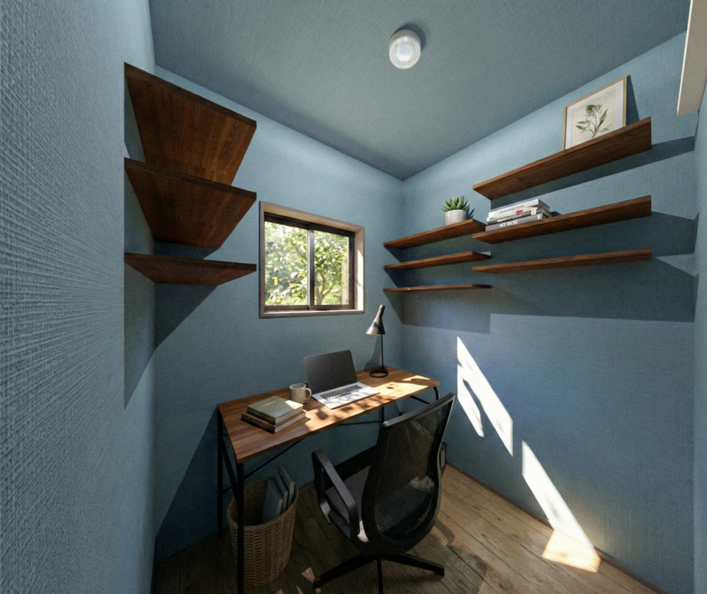 読書中心なら本のサイズに合わせた可動棚と、疲れにくい間接照明で“こもれる居場所”に。