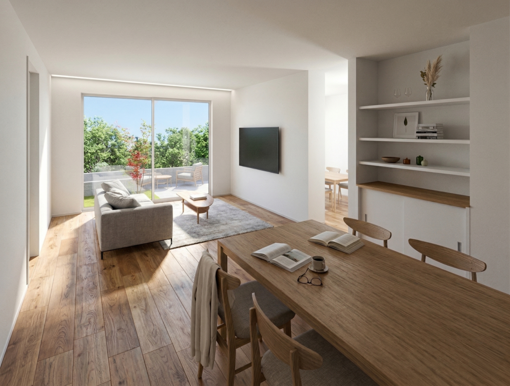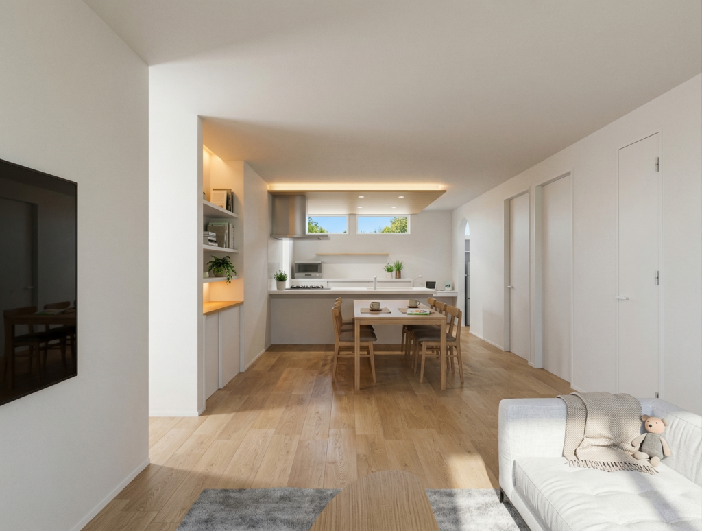室内に入ると、やわらかな光に包まれた心地よいLDKが広がります。明るさと開放感を感じられる空間でありながら、家族それぞれが自然体でくつろげる落ち着きも大切にしました。ナチュラルでやさしい雰囲気のインテリアは、日々の暮らしにそっと寄り添い、何気ない時間まで心地よく整えてくれます。